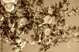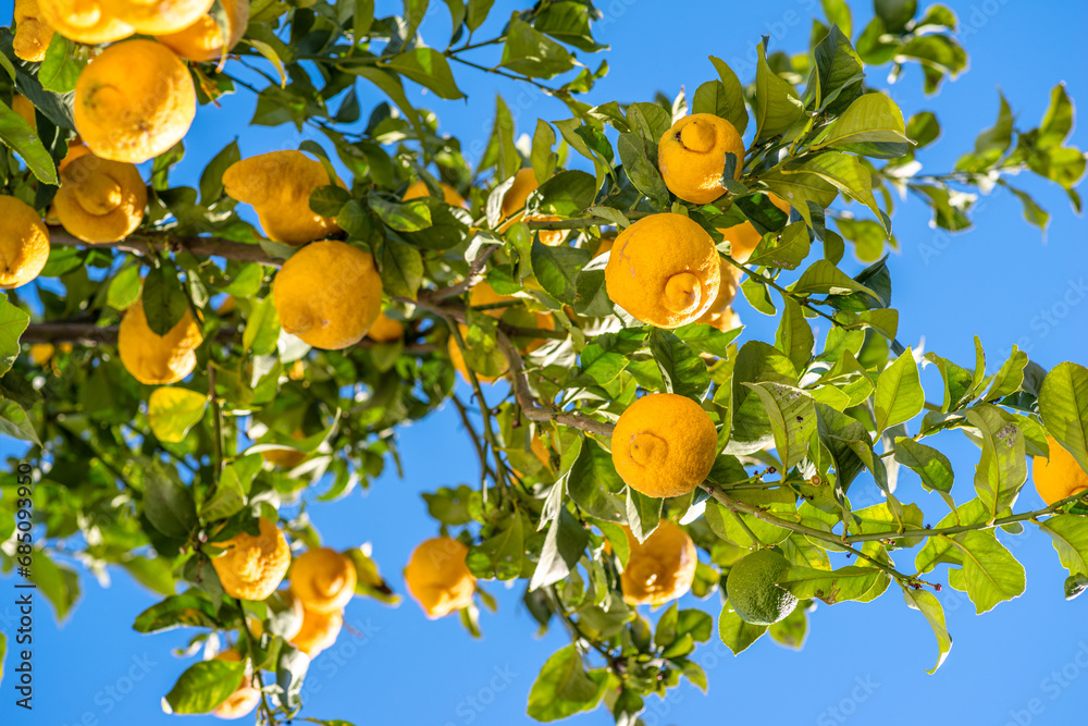 Ripe lemon fruits on lemon tree and blue sky at the background. View below.