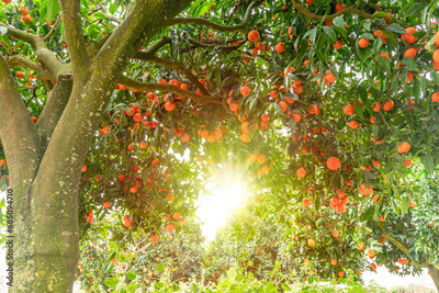 Tangerine tree or Citrus tangerina completely covered with ripe fruits. Great harvest in the orchard.