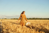 Pregnant woman in the rays of the sunset. Beautiful young girl is walking in the field expecting the birth of a child. Motherhood, pregnancy and happiness concept.
