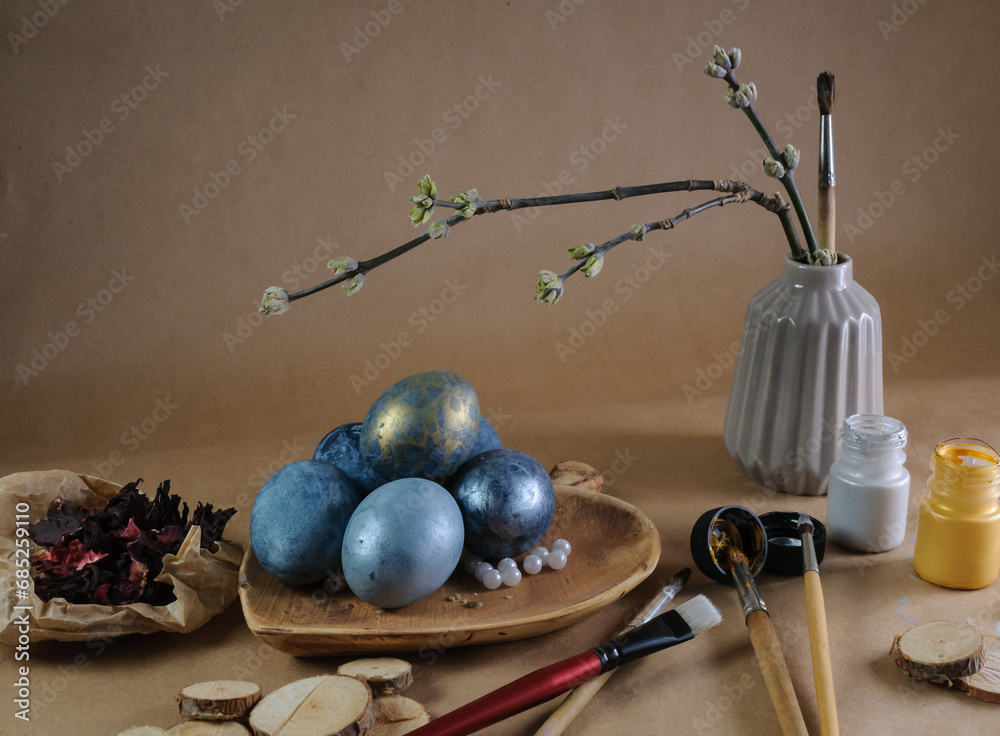 Few painted chicken eggs on wooden plate, dried red petals on crumpled paper and tree branch and paint brush in little ceramic bowl