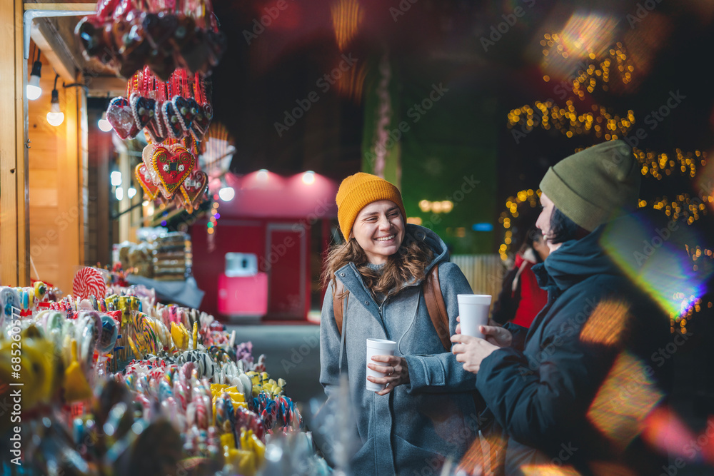 Two happy young women friends with mulled wine stands walking at a Christmas market in a European city