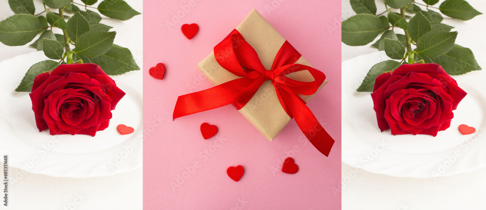 Collage of table setting for Valentine's day and gift box on the pink and white background. Close-up.
