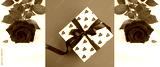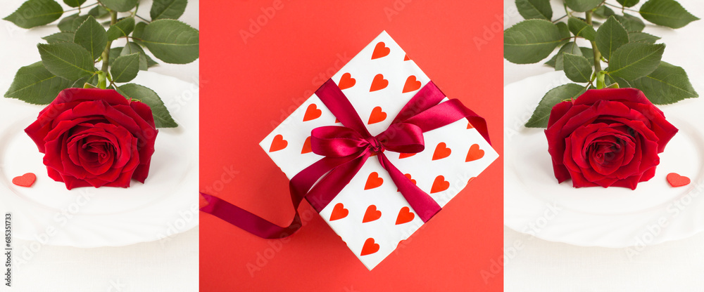 Collage of table setting for Valentine's day and gift box on the red and white background. Close-up.