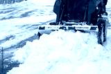 Minitractor bucket clears snow from the neighborhood after a snowstorm. Fragment.