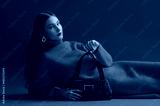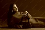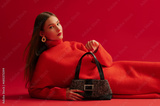 Fashionable confident woman wearing trendy red knitted turtleneck dress, golden earrings, holding baguette bag, posing, laying on red background. Studio fashion portrait. Copy, empty space for text