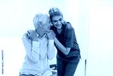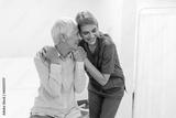 The elderly woman enjoys an embrace from her favorite healthcare doctor. Medical care, young female doctor hugging patient. Empathy concept. Elderly woman hugging caregiver