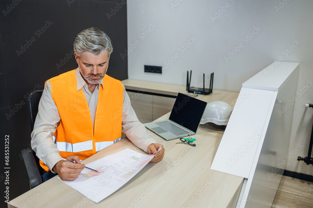 Portrait of Handsome Male Engineer Wearing Safety Vest Working on blueprints drafts, Developing pipes conditioning system. Architect project