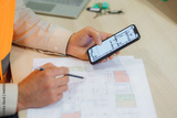 architect sitting at the desk, holding pen and working on phone with sketches of building object closeup