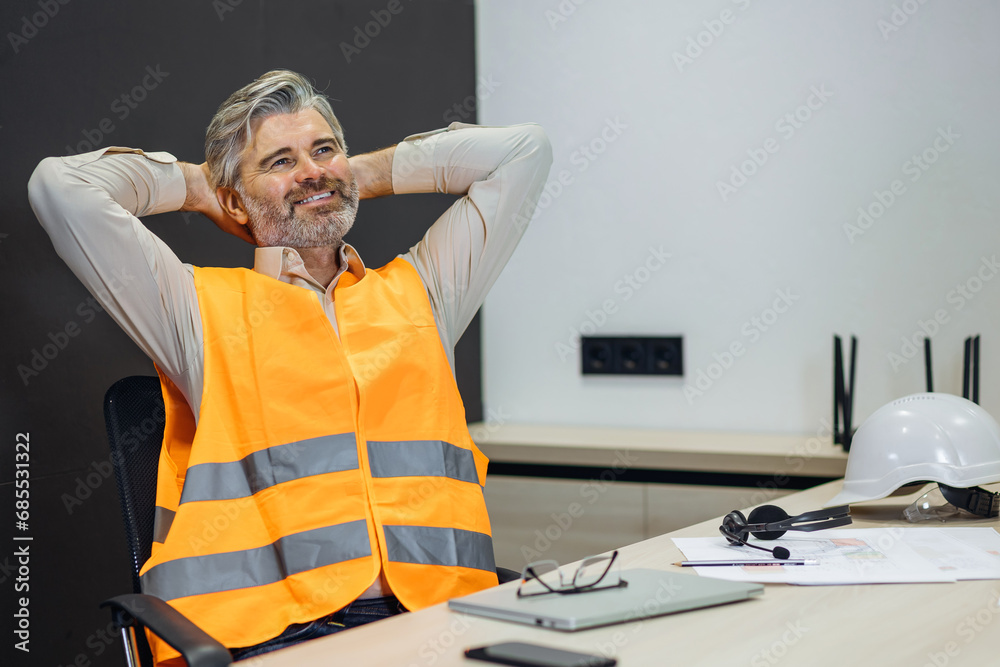 senior mature old male architect working in the office taking a break stretching hands