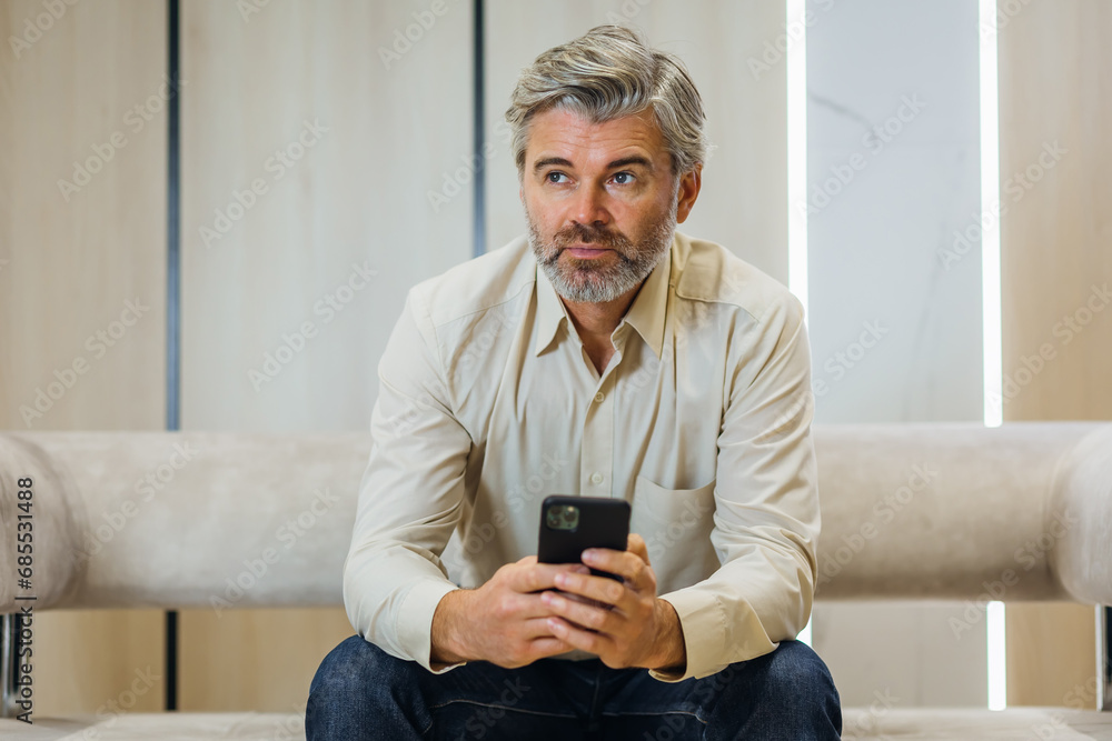 Senior man in formal clothing looks pensive using smartphone while sitting on the sofa at office