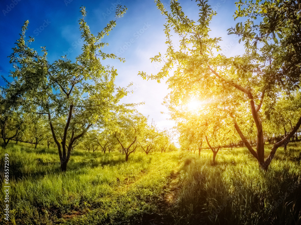 Fantastic apple orchard is illuminated by sunlight and blue sky. Glowing soft filter.