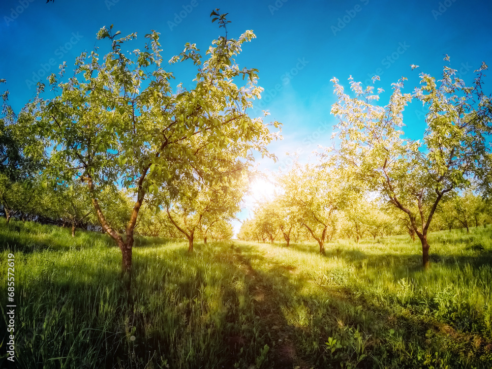 Fantastic apple orchard is illuminated by sunlight and blue sky. Glowing soft filter.