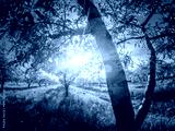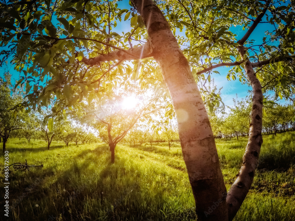 Fantastic apple orchard is illuminated by sunlight and blue sky. Glowing soft filter.