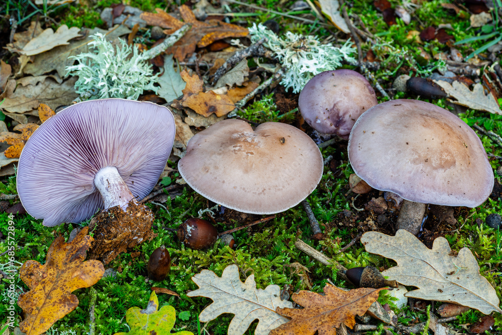 Lepista nuda. Blue foot mushrooms, on the oak forest floor.