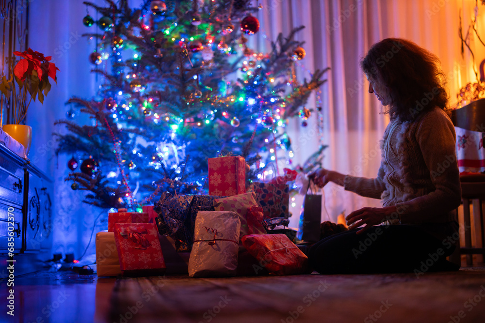 Adult Woman Preparing Christmas Gifts Set Up under Christmas Tree in the Night Surrounded by Festive Lights and the Warm Glow of the Christmas Tree