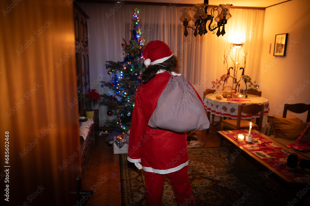 Single Mother Steps into a Festive Living Room, Dressed as Santa, Carrying a Sack Full of Presents Over Her Shoulder. Ready to Create Joyful Memories in the Traditional Holiday Ambiance