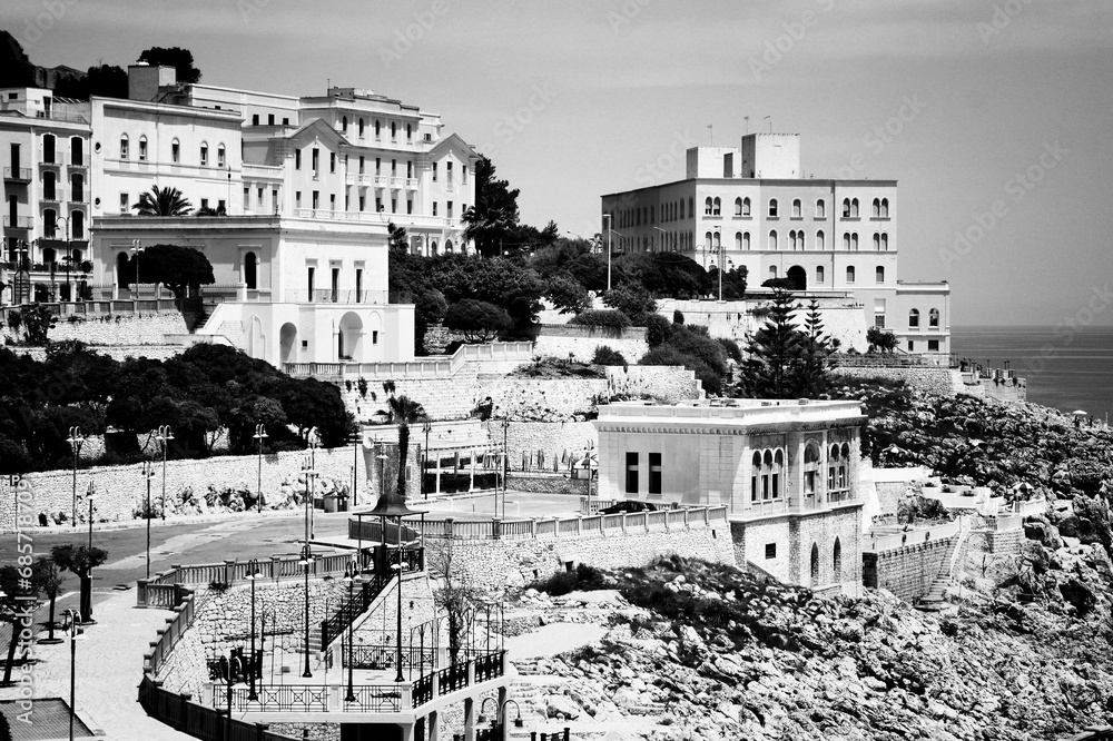 Santa Cesarea Terme - Italian small town. Black and white photo retro style.