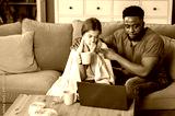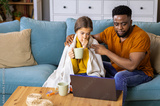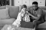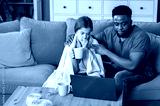 African American father and daughter with fever sitting at home and have online consultations with the doctor via laptop.