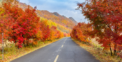 Panorama of the road through the Laobiangou canyon in autumn near Benxi, China