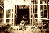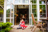 Cute and happy brother and sister sitting on the porch of a country house.