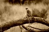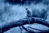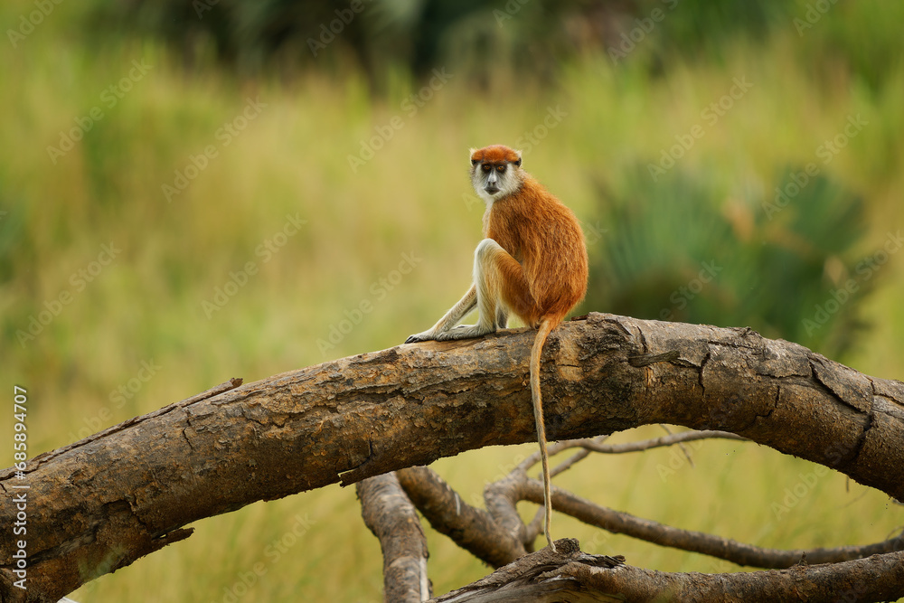 Common patas monkey - Erythrocebus patas also hussar monkey, ground-dwelling monkey distributed in the West and East Africa, stand and guard on the tree, feed on the ground