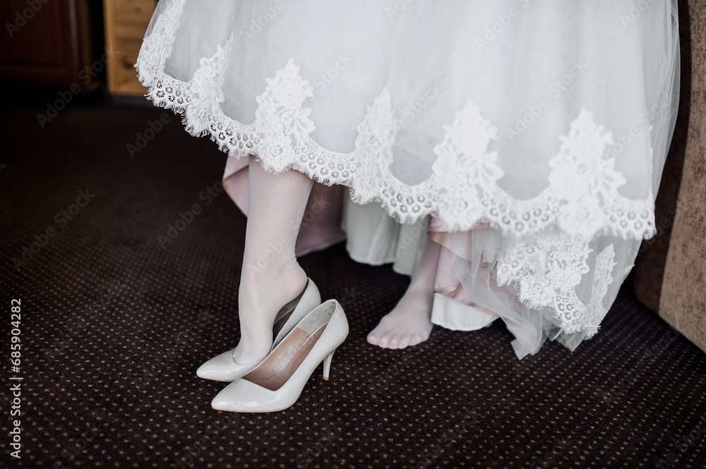 The bride in a white dress puts shoes with heels on her feet in the morning in the room. Wedding photography.