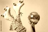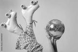 Beautiful young woman in roller skates with disco ball on color background, closeup