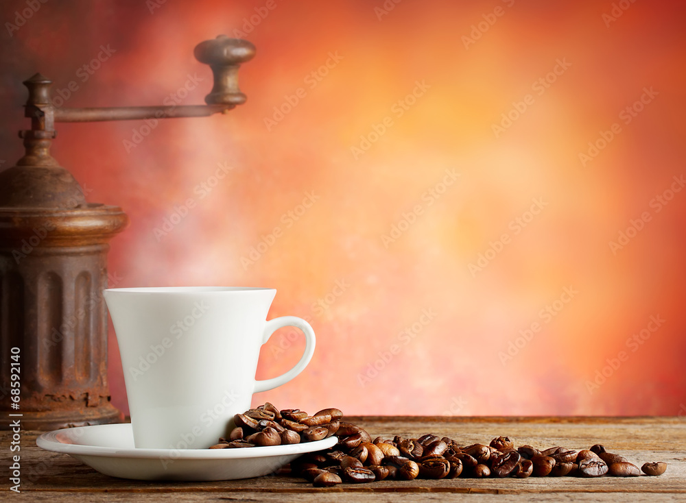 White cup with coffee beans and grinder