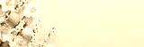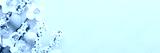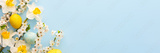 Festive banner with spring flowers and Easter eggs, white daffodils and cherry blossom branches on a blue pastel background
