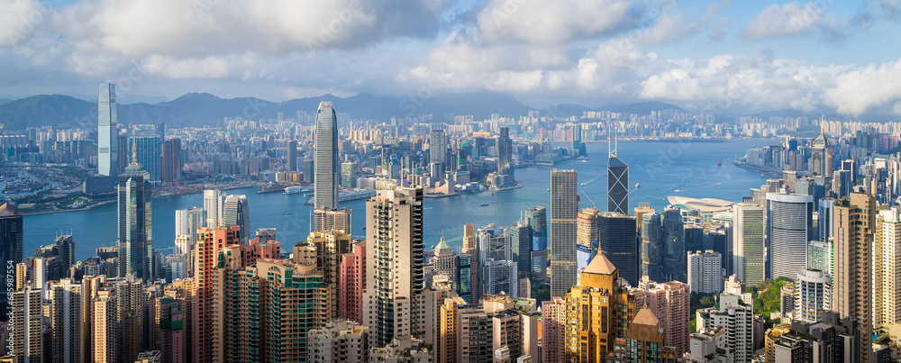 Panoramic view of Hong Kong City in cloudy day and good weather. View of financial district high-rise and residential buildings from Victoria Peak Observation Deck.