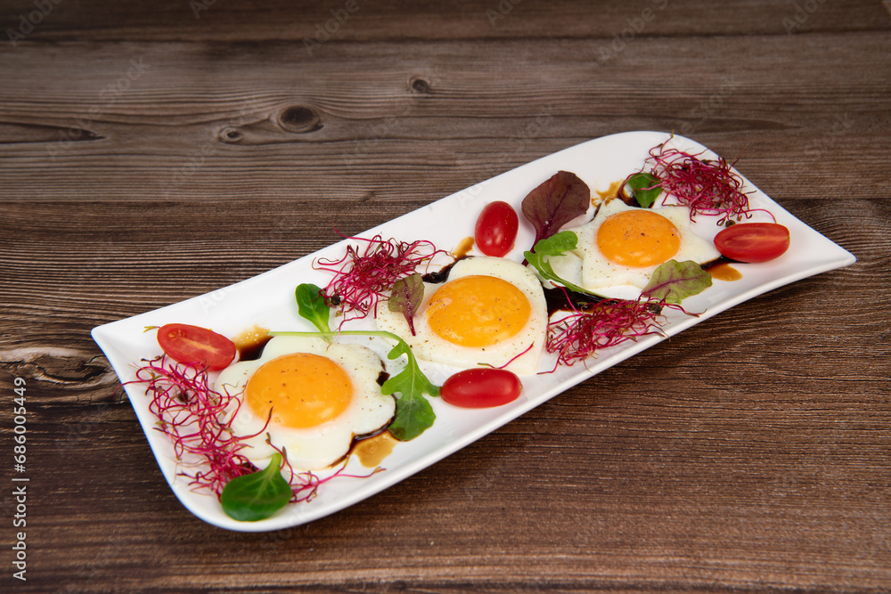 RECIPE FOR FRIED EGGS AND POMEGRANATE MOLASSES CUT INTO HEARTS, STARS AND FLOWERS. High quality photo