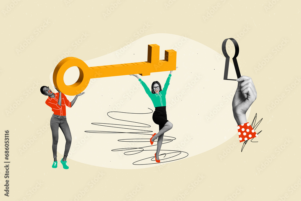 Poster collage image of happy smiling people hold huge key opening lock isolated on drawing background