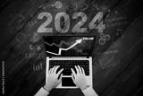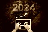 Top down view businessman hand typing on a laptop computer with business chart and number 2024