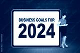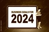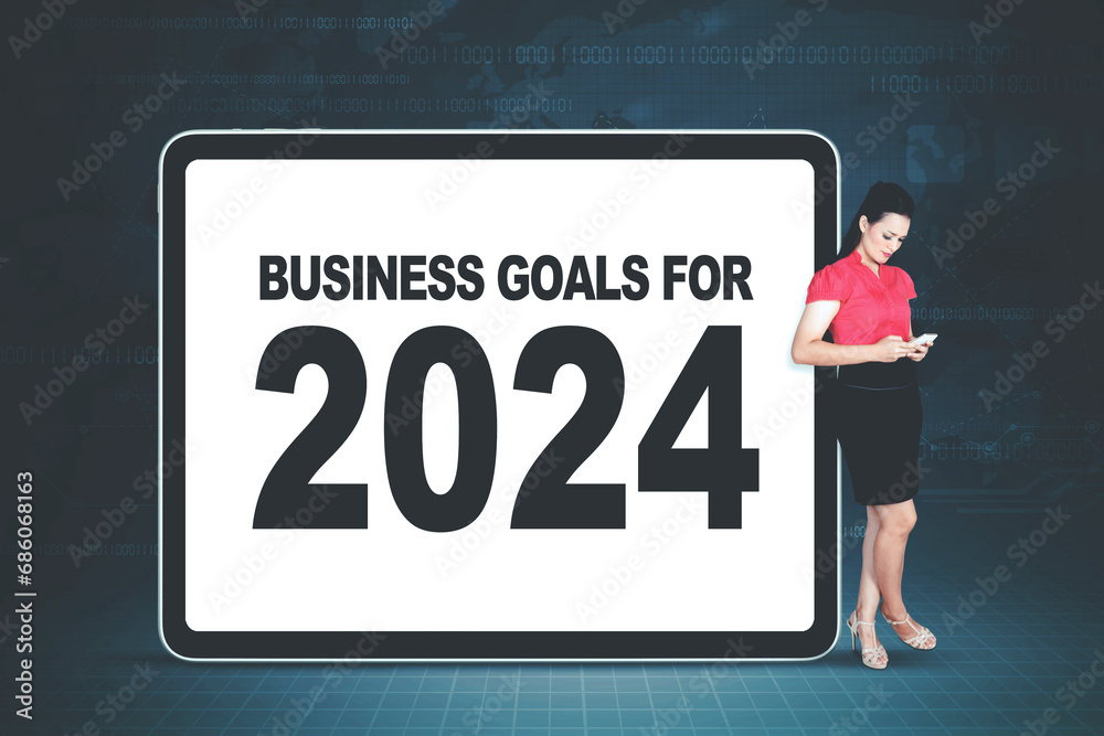 Young businesswoman using a mobile phone leaning on a big tablet with text of business goals for 2024