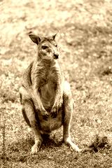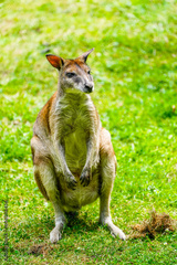 Portrait of a red-necked wallaby on a green meadow. Notamacropus rufogriseus. Bennett's wallaby. Kangaroo.