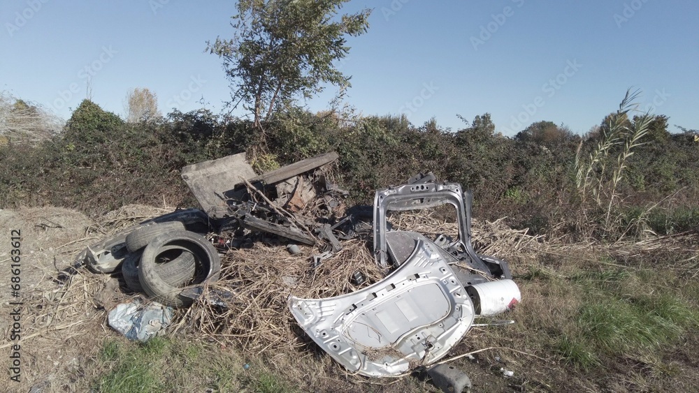car destroyed and demolished illegally in the countryside by the mafia underworld - environmental pollution and crime against nature and people's health - illegally disposing of dangerous waste