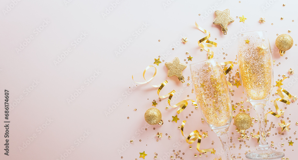 Happy New year celebration background concept. Champagne glass , golden ribbon, stars and christmas ball on pastel background.