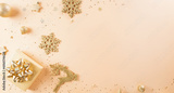 Happy New year celebration background concept. Golden gift box, stars, christmas ball and champagne on pastel background.