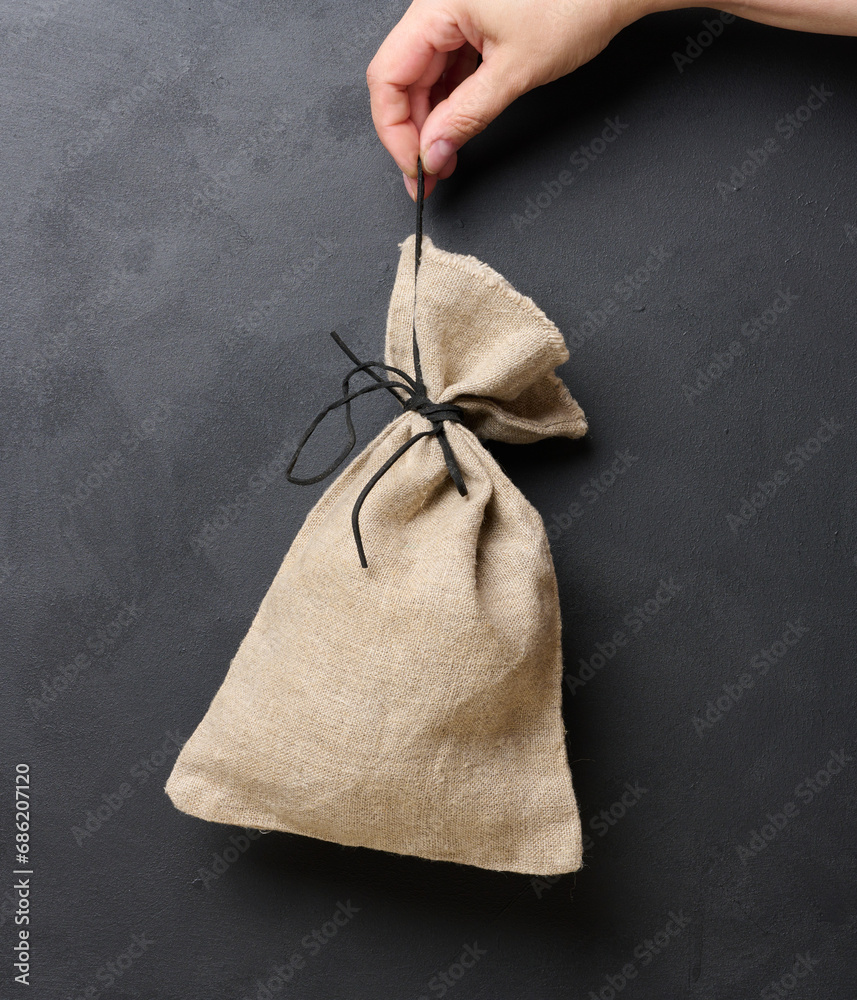 A woman's hand holds a canvas bag on a black background, the concept of a subsidy