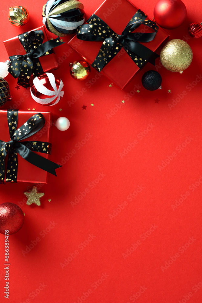 Vintage Christmas decorations and gift boxes on red vertical background. Retro style. Top view. Flat lay.