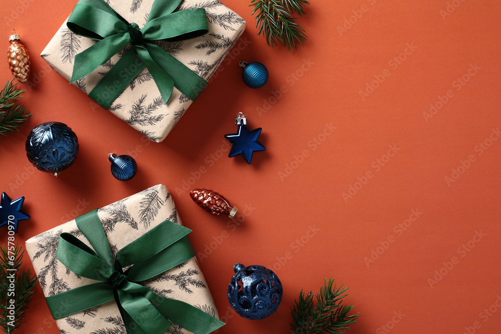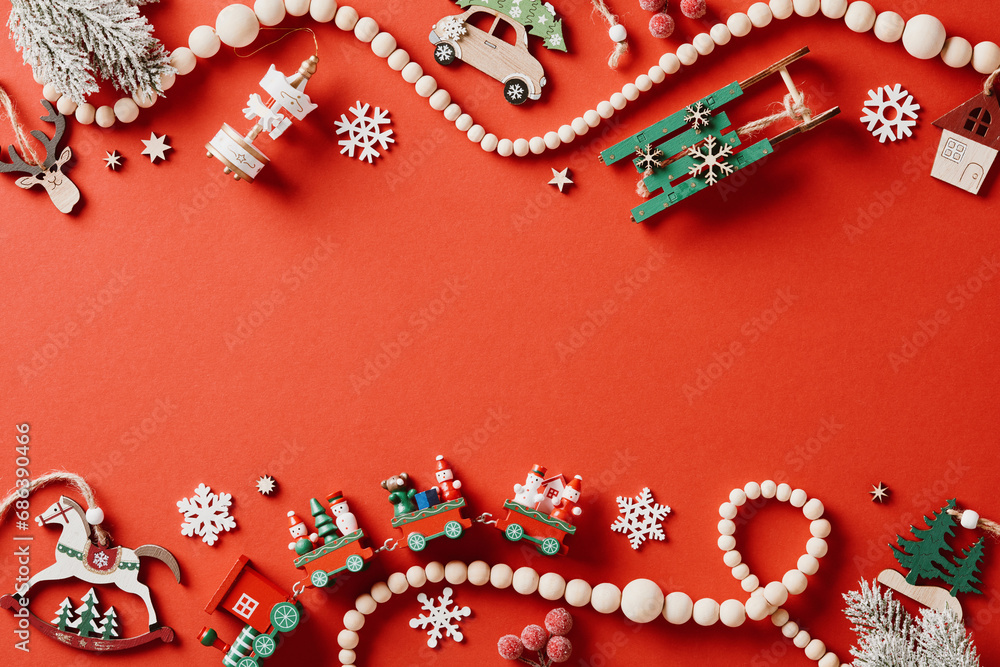 Vintage Christmas card template. Flat lay composition with wooden locomotive, sleigh, garland, horse, merry go round, snowflakes on red background