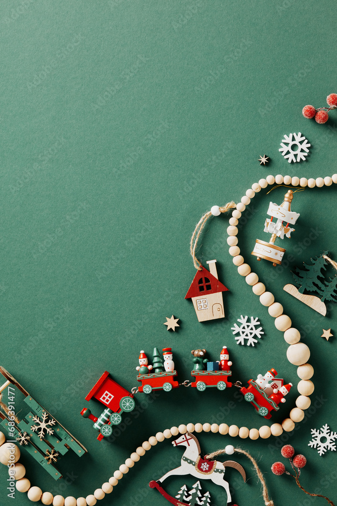 Vintage Christmas flat lay composition with wooden handmade toys and garland on green background