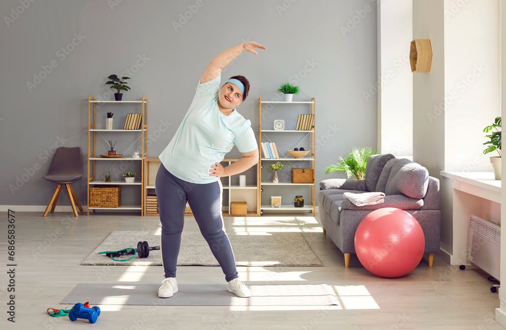 Full length photo of a happy funny young smiling fat overweight woman wearing sportswear doing fit exercise in the living room at home. Workout sport, fitness and body positive concept.