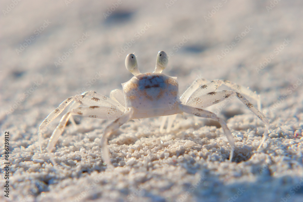 Close Up Full frame of a Juvenile Ghost Crab on White Sand Coral beach