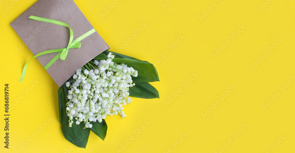 Lily of the valley in a paper bag on the yellow background. Top view. Copy space.