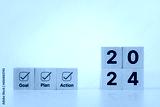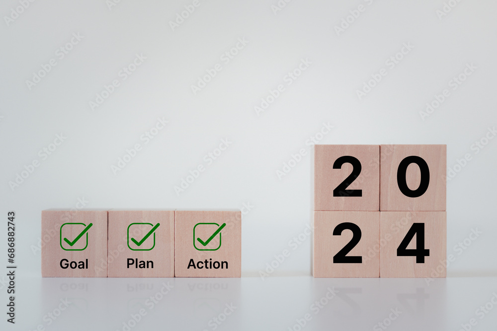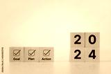 2024 Goal plan action concept. Wooden cube blocks with text 2024, goal, plan and action prepare to do the list and plan for New Year. Business target achievement. Starting a new year, project, or life