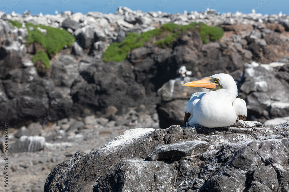 A Nazca booby (Sula grant) sitting on rocks, Galápagos Islands.