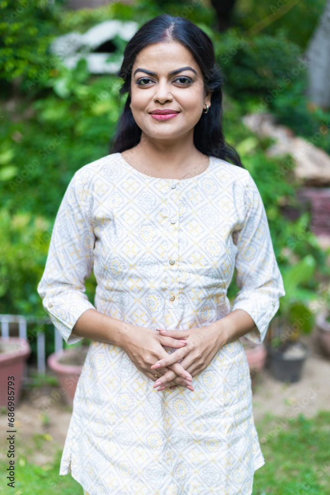 Happy Young Indian woman standing in public park enjoying. lifestyle concept