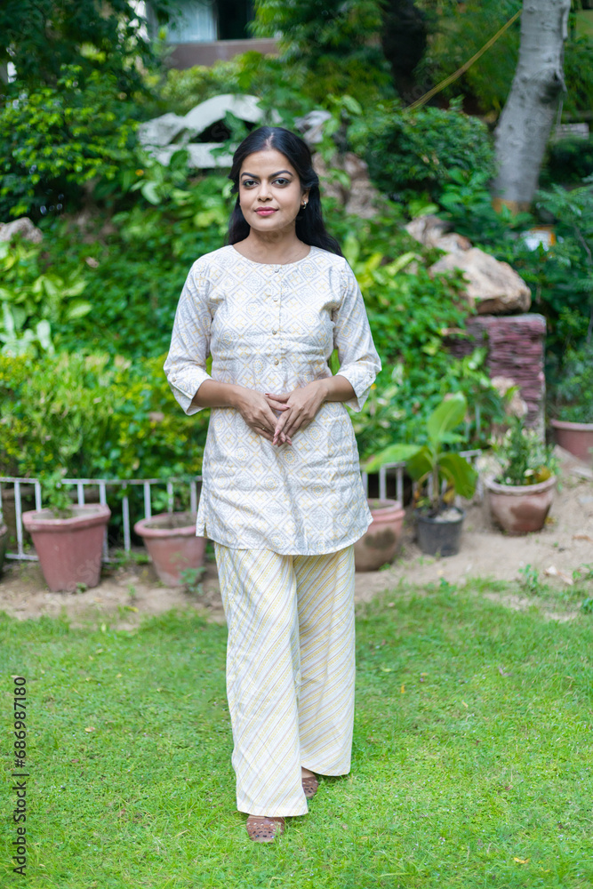 Happy Young Indian woman standing in public park enjoying. lifestyle concept