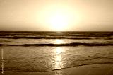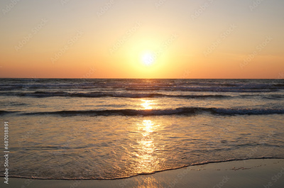 美しい波打ちぎわと夕陽の風景、日本海、出雲の稲佐の浜